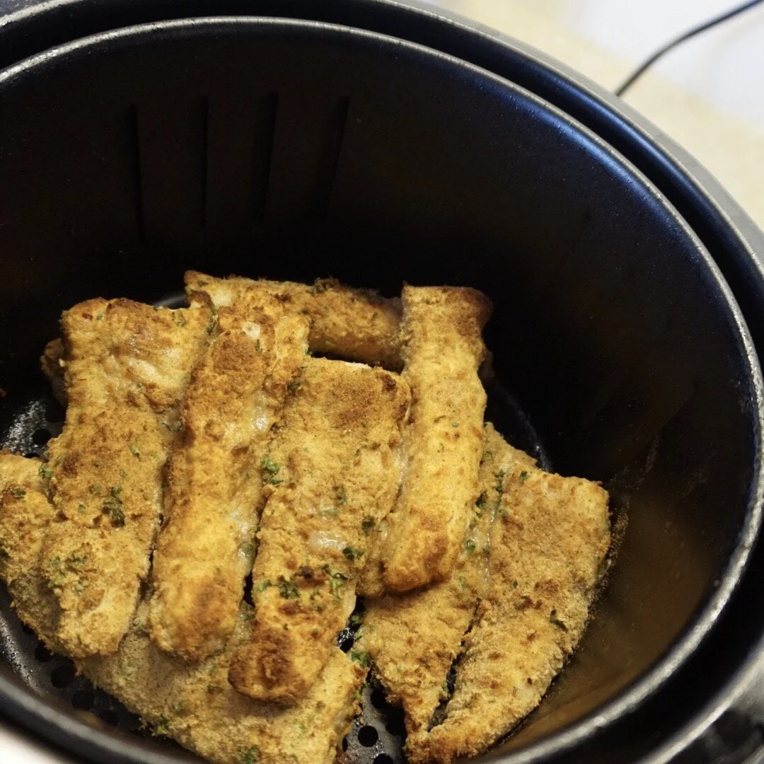 Lay the strips on top of each other in the Air Fryer basket with a spray of Fry Light, you could use any spray oil if you aren’t a fan of Fry Light. If you don’t have an Air Fryer pop them onto a baking tray lined with a sheet of greaseproof paper. Cook for 180′ for around 8 minutes then turn over and cook for another 8 minutes.