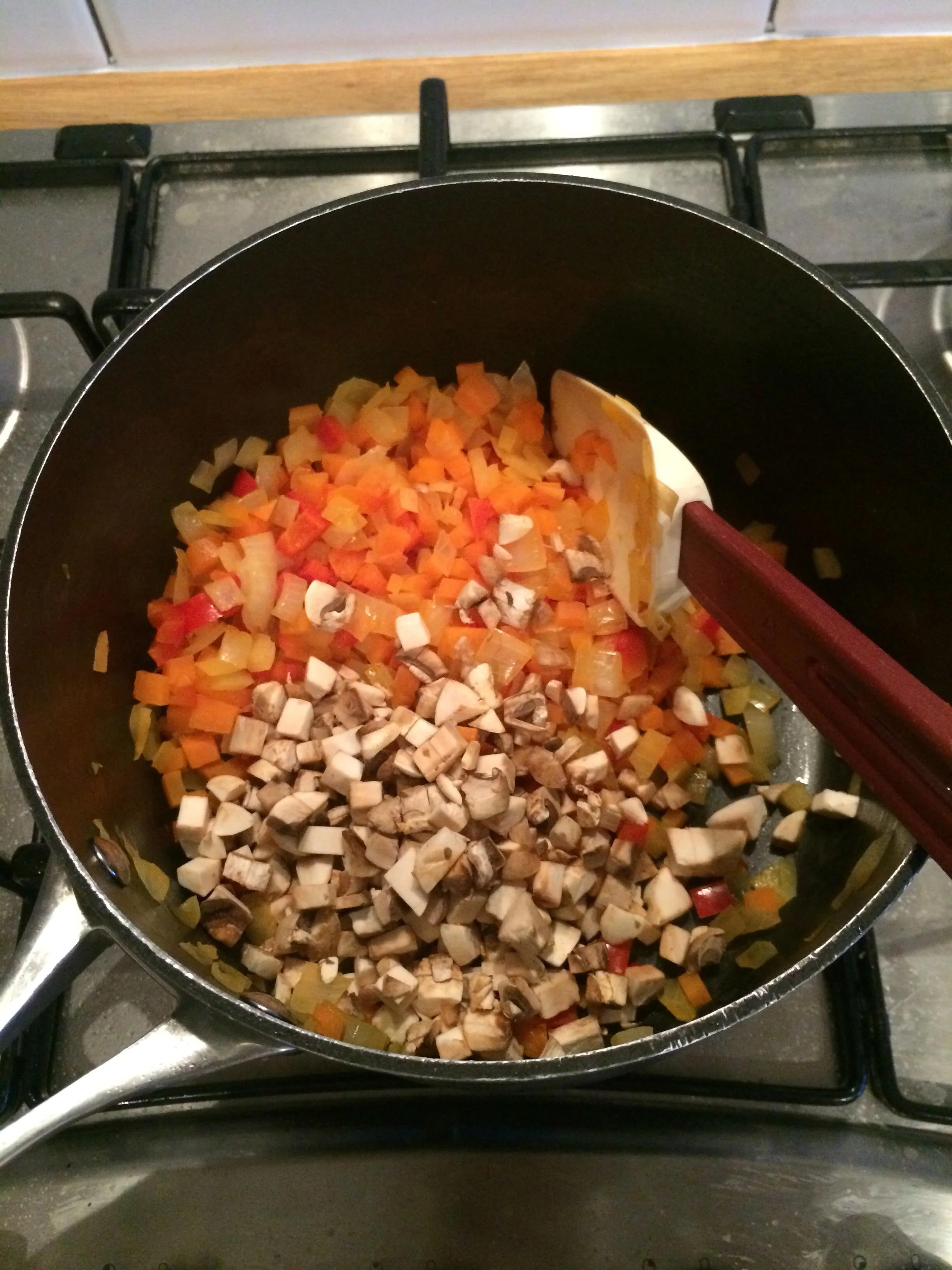 Sweat the onions, carrots and peppers for around 5 minutes, then add the mushrooms.